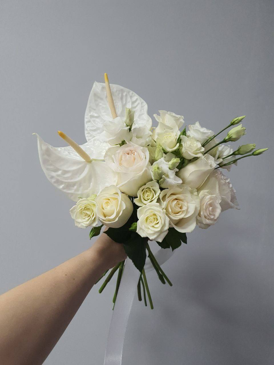 Букет из антуриумов, одноголовой и кустовых роз, эустомы quantity