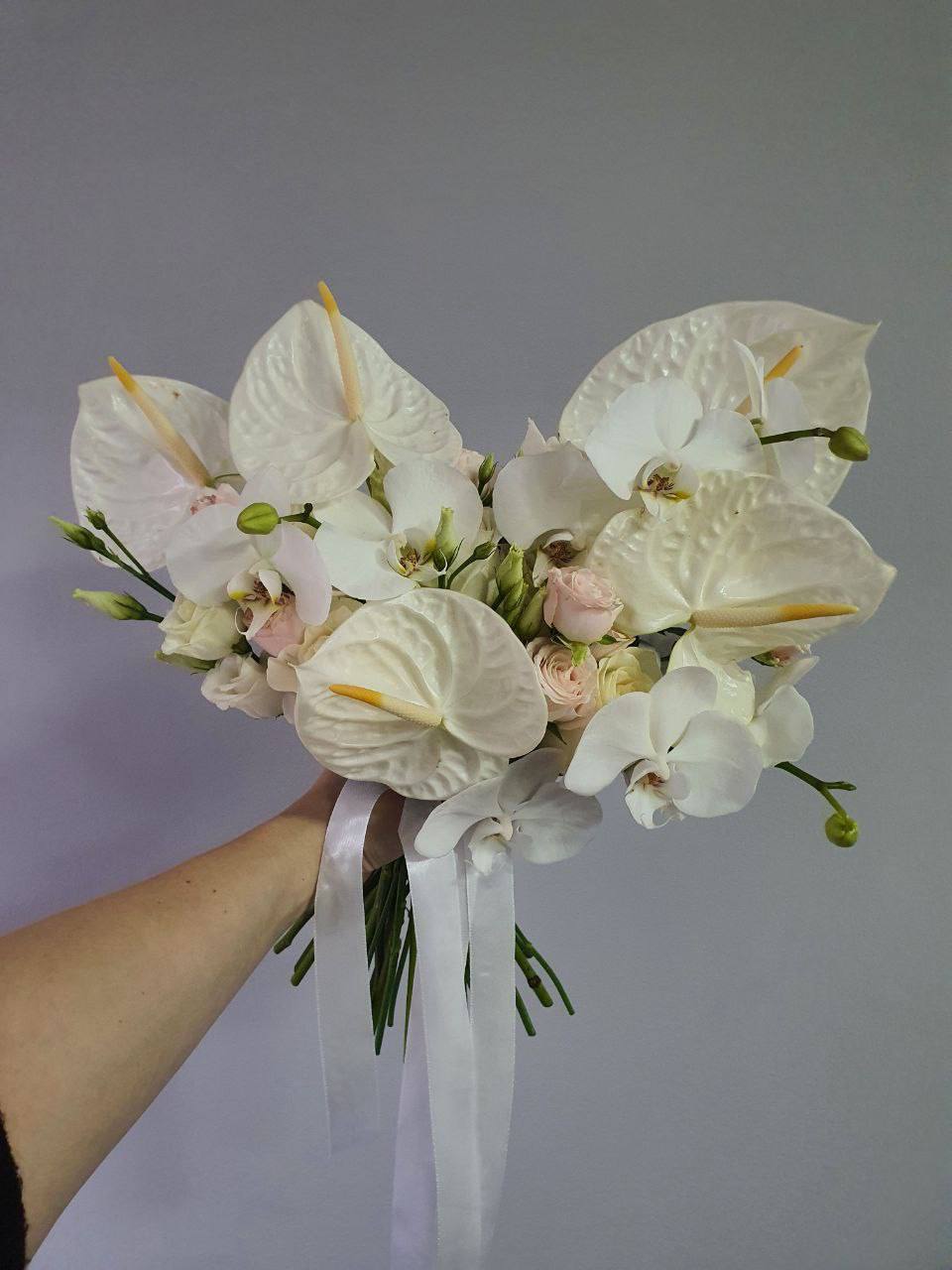 Букет из антуриумов, орхидей, эустомы и кустовой пионовидной розы quantity