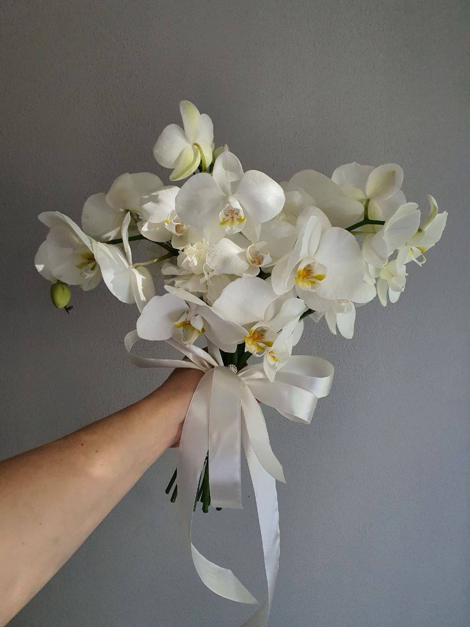 Букет из белоснежных диантусов и орхидей quantity