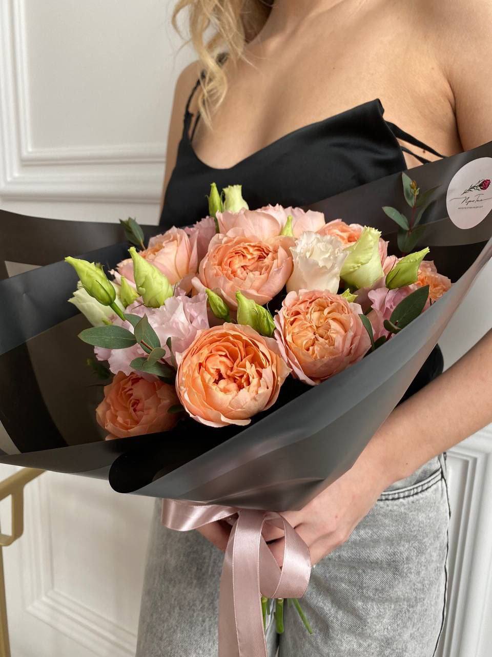 Букет из кустовой пионовидной розы Джульетта и розовой эустомы