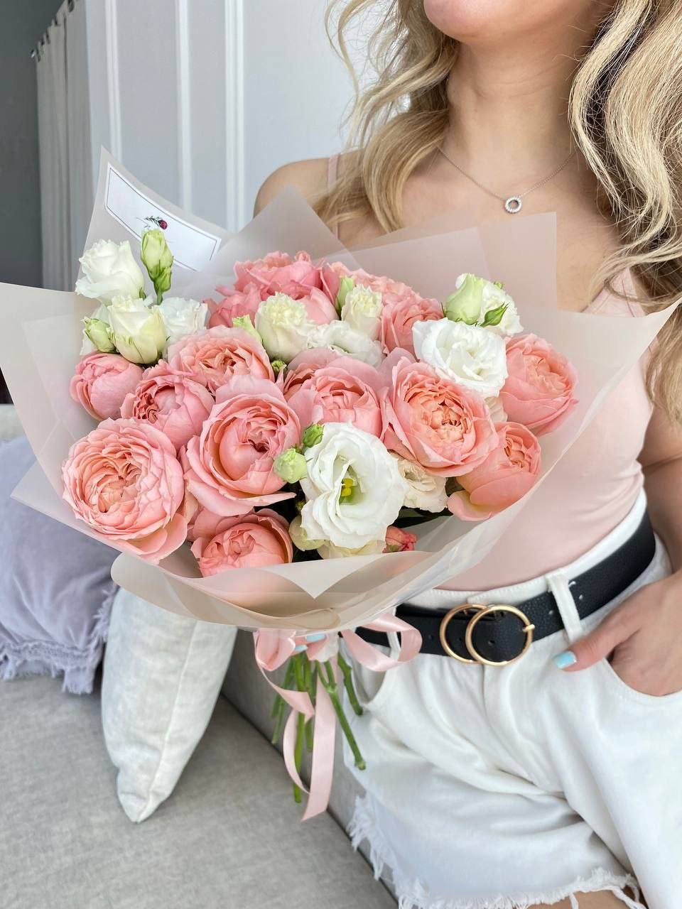 / Букет из кустовой пионовидной розы Джульетта и эустомы