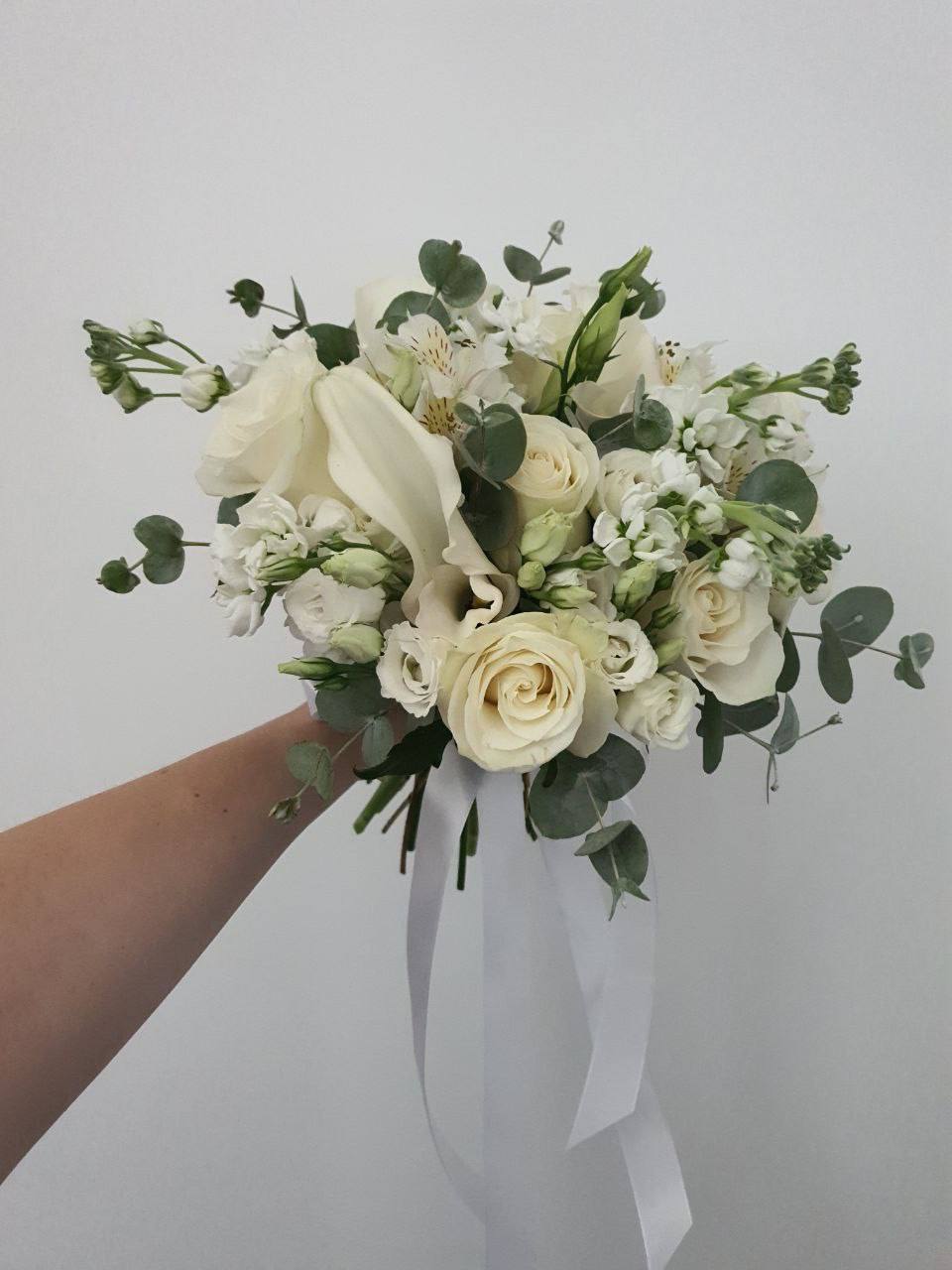 / Букет из эустомы, матиоллы, роз, калл и эвкалипта