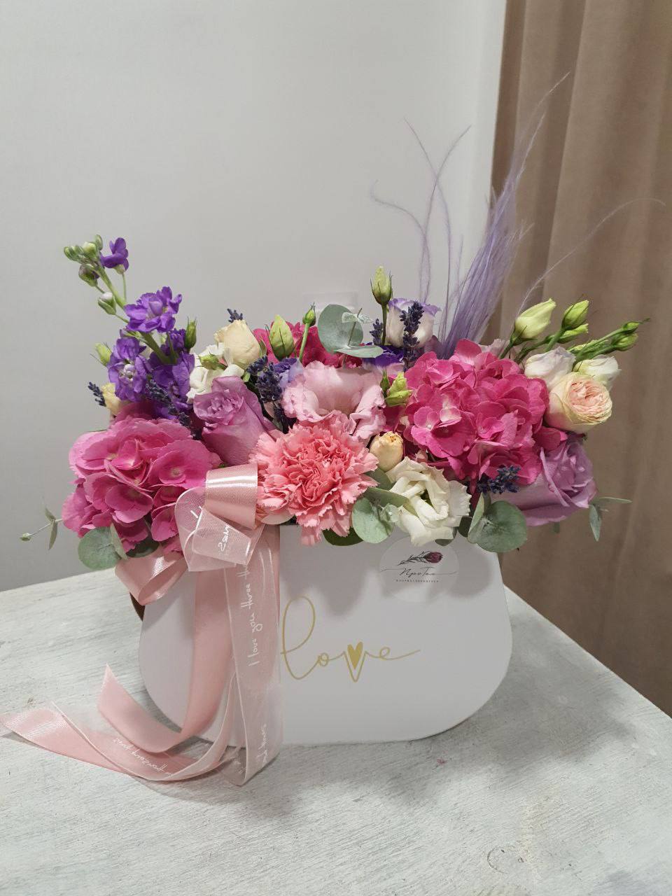 Сумочка из гортензий, диантусов, эустомы, одноголовых и кустовых роз, матиоллы quantity
