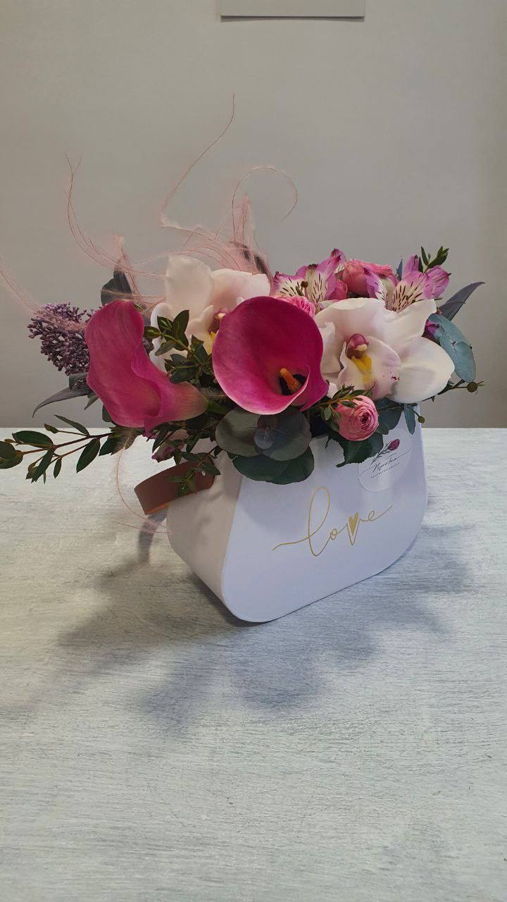 Сумочка из кустовых и одноголовых роз, эвкалипта, альстромерий и орхидей