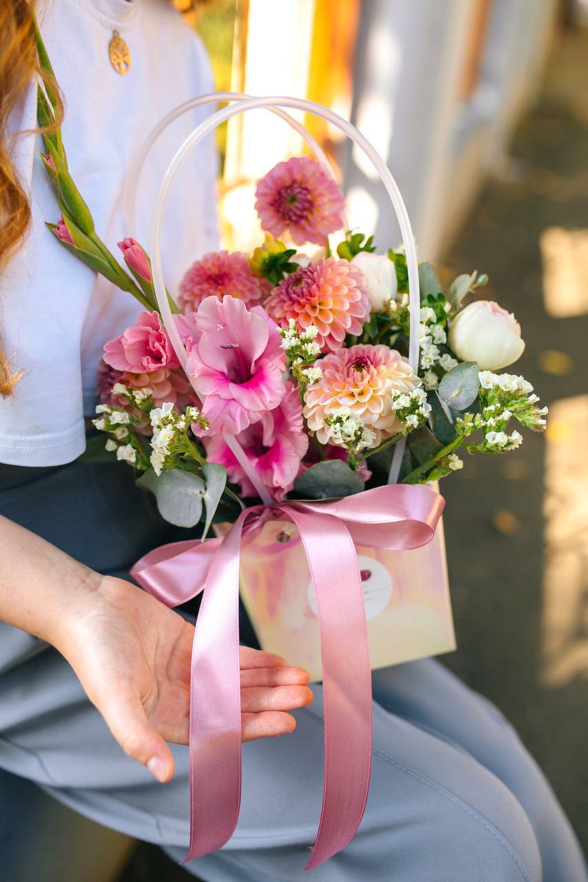 Сумочка с георгинами, гладиолусами, старицей, эвкалиптом и розой quantity
